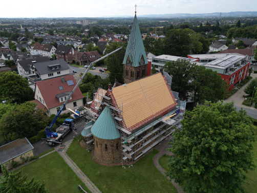 Die Neueindeckung erfolgte mit Tonziegeln des Typs Meyer Holsen Tandem. Diese Ziegel vereinen eine traditionelle Optik mit moderner Funktionalität und sind besonders langlebig. Durch ihre Form und Farbgebung fügen sie sich harmonisch in das historische Gesamtbild der Kirche ein.